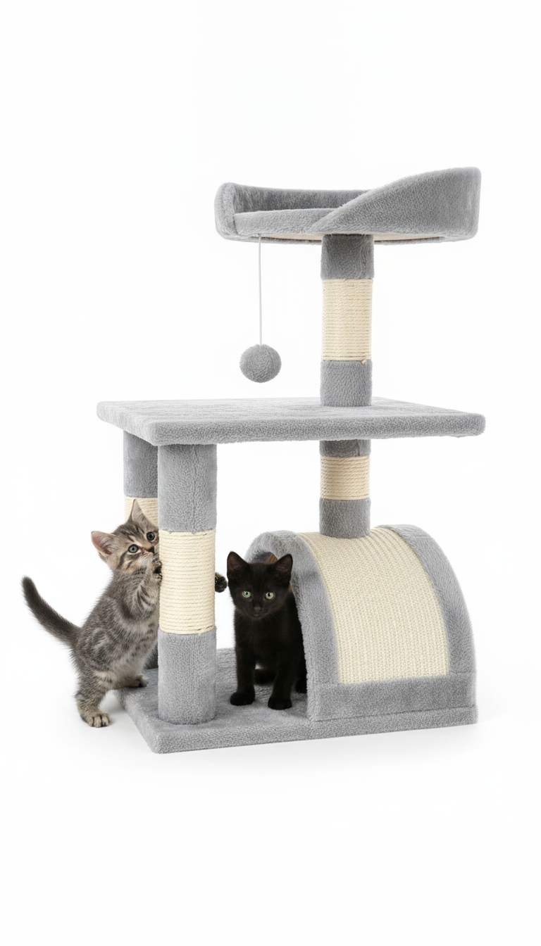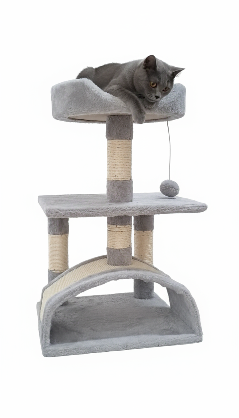 Arranhador multinível com postes de sisal, três plataformas e brinquedo bolinha integrado. Proporciona diversão, descanso e estímulo natural ao instinto felino, além de proteger seus móveis.
