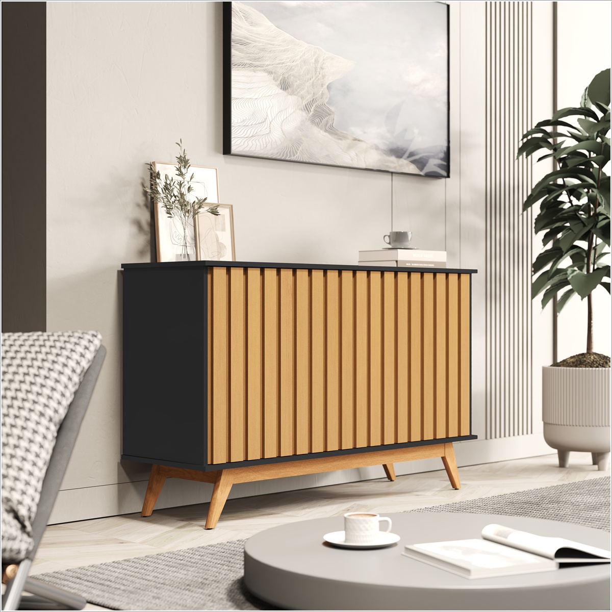 O Buffet Juçara é a escolha perfeita para quem busca um móvel elegante, robusto e funcional. Com design ripado e acabamento nas cores Preto e Nature, ele proporciona um visual moderno e sofisticado, combinando com salas de jantar, áreas gourmet, salas de estar e ambientes contemporâneos.