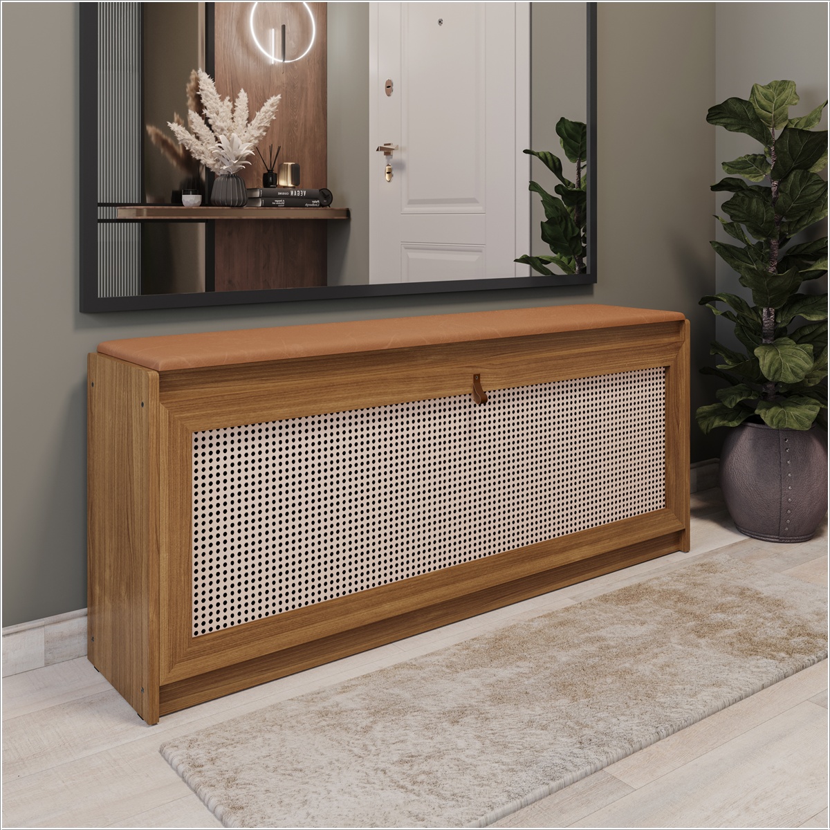 O Banco Sapateira Plenitude é a escolha ideal para quem deseja manter os calçados organizados sem abrir mão de conforto e elegância. Com assento almofadado em corino marrom e frente em ratan sintético, ele combina design moderno com um toque rústico, valorizando qualquer ambiente.