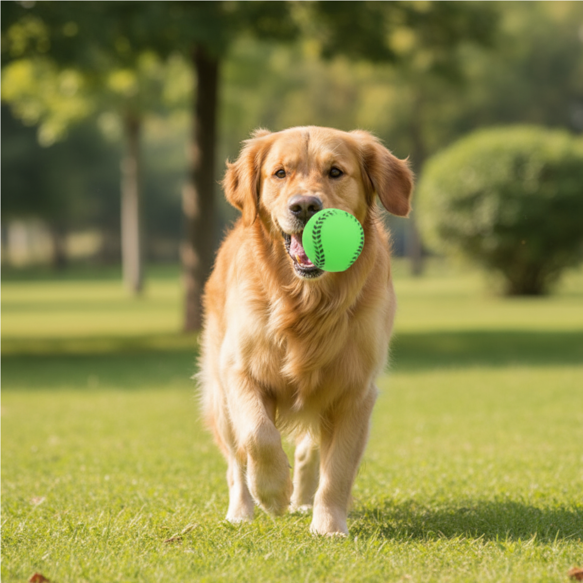 Bola em borracha TPR com design esportivo inspirado em beisebol, apito interno e tamanho ideal para brincadeiras de buscar com cães de pequeno e médio porte.