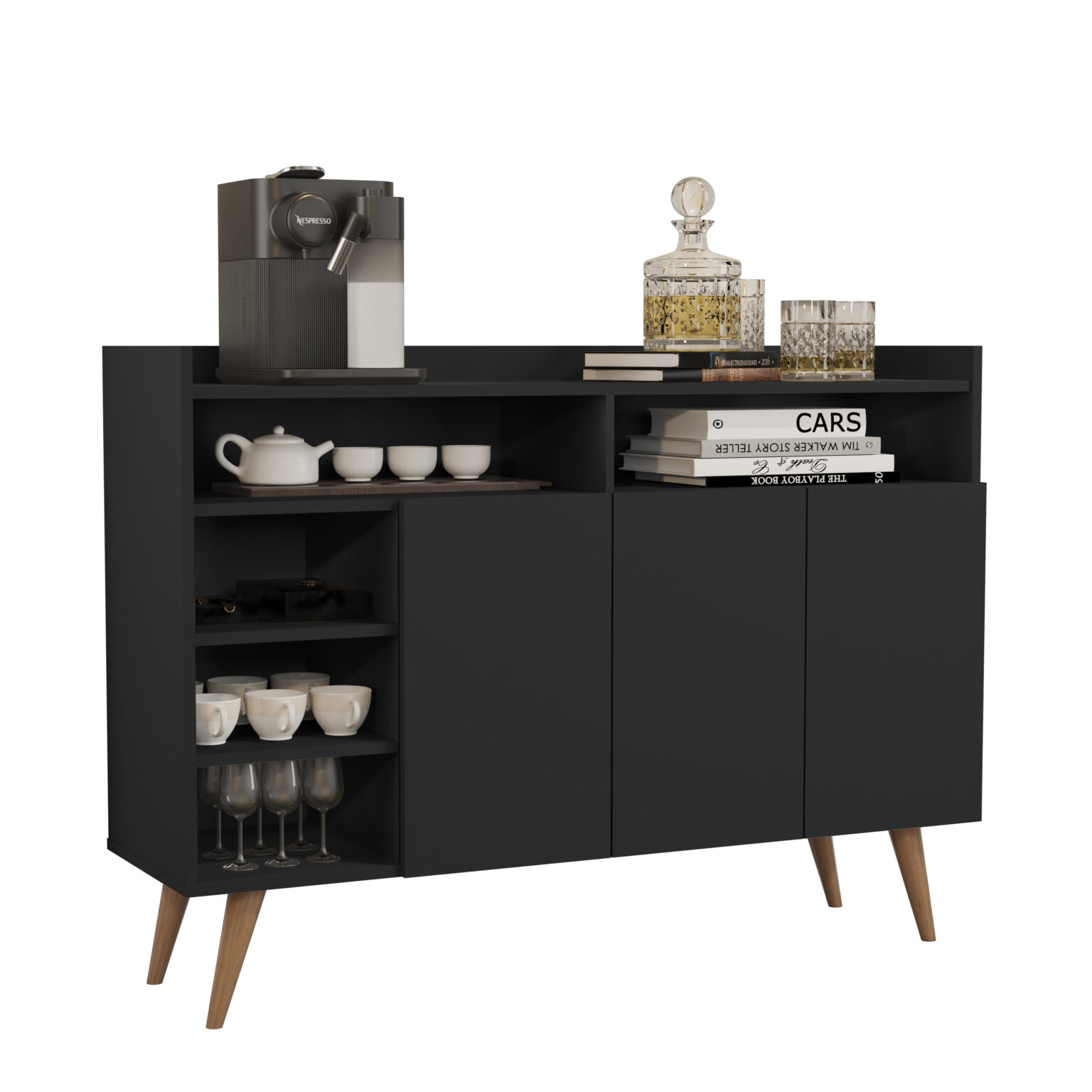 Seu design compacto e funcional permite armazenar objetos diversos, mantendo o ambiente organizado sem ocupar muito espaço. Fabricado em MDP, oferece boa resistência e estabilidade, e conta com quatro portas que facilitam o acesso interno.