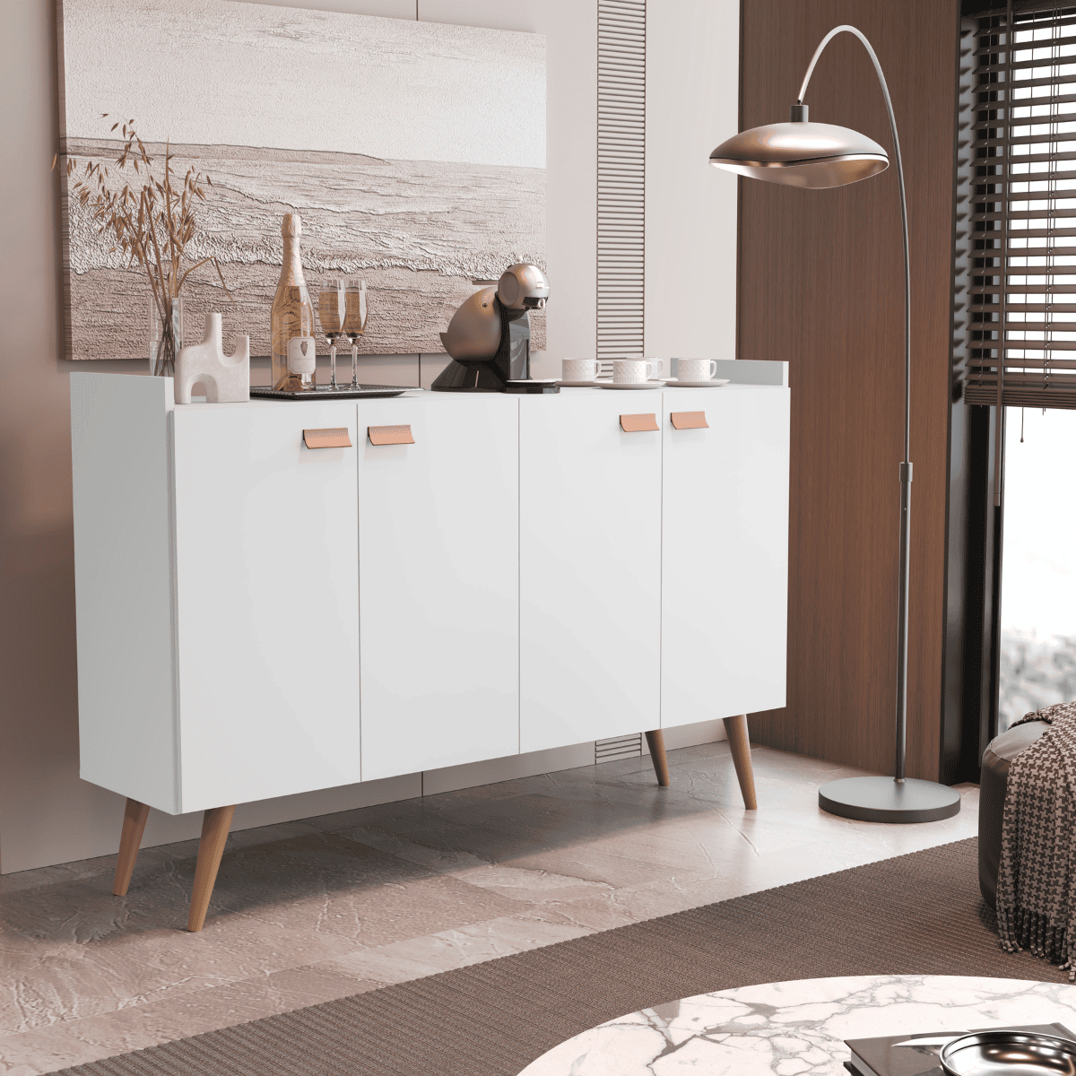 • Prateleira central ripada, oferecendo visual leve e elegante.