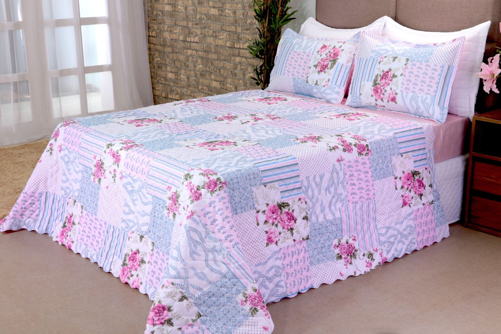 Cobreleito estampado em microfibra com toque macio e acabamento matelassado. Proporciona conforto térmico, praticidade no dia a dia e um visual delicado para a cama Queen.