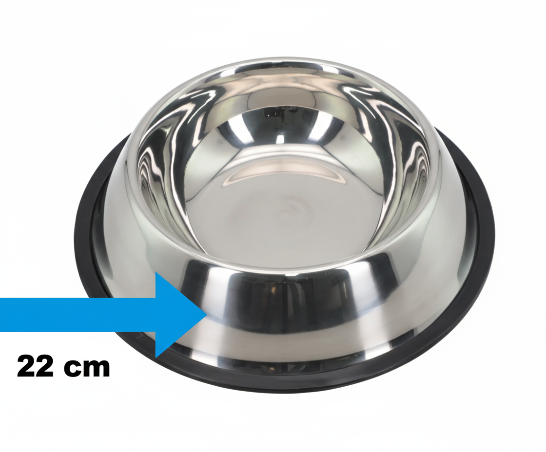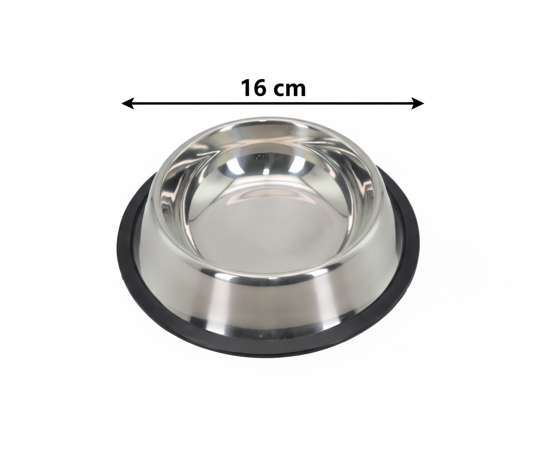 Comedouro em aço inox liso com base antiderrapante, oferecendo estabilidade, durabilidade e facilidade de limpeza. Ideal para cães e gatos de diferentes portes.