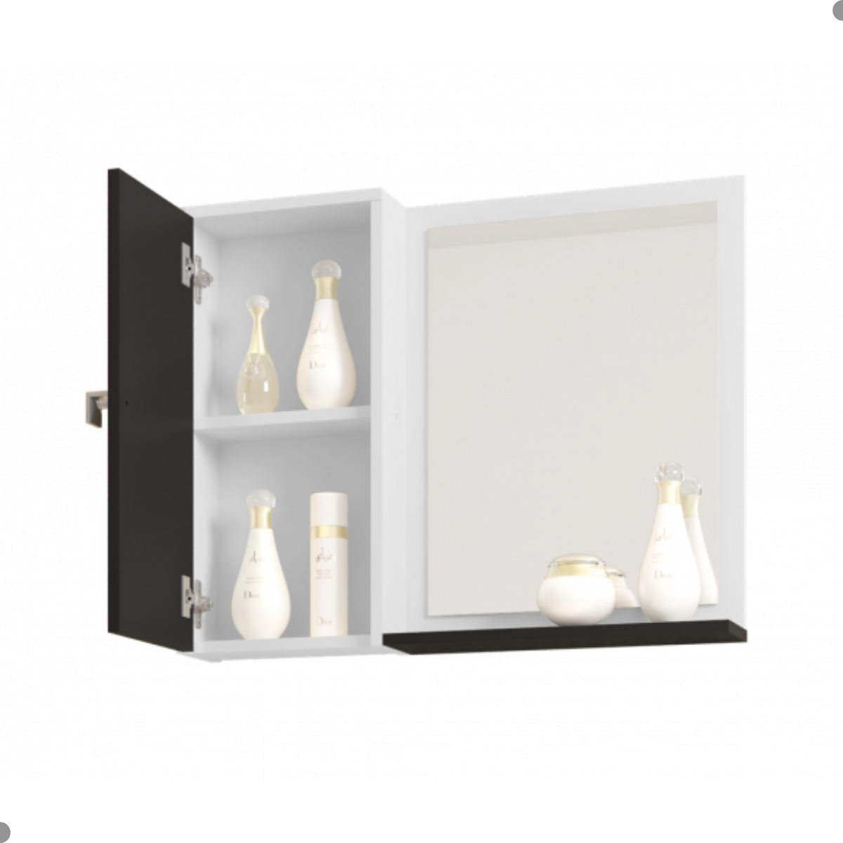 Gabinete de banheiro de tamanho médio, produzido em madeira, com acabamento em branco e preto fosco. Estrutura resistente, ideal para uso diário e acompanha instruções para montagem.