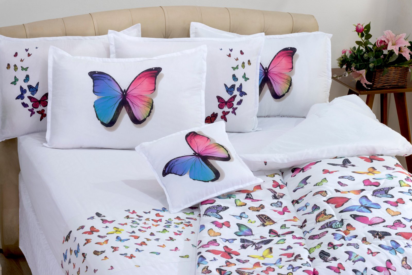 Conjunto de cama em percal 180 fios, 100% algodão, com estampa de borboletas. Acompanha lençol com elástico, fronhas e capa de almofada, trazendo conforto e leveza ao quarto.