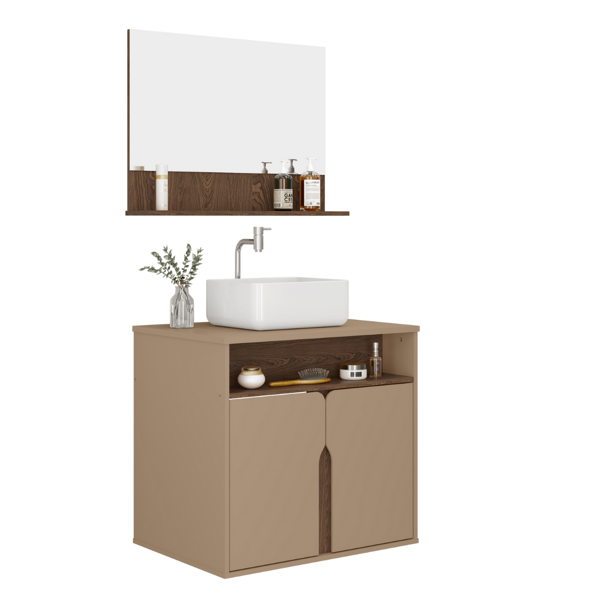 O Kit Banheiro Harmonia combina funcionalidade, design moderno e tonalidades elegantes de Fendi com Carvalho. Completo com espelho e pia, é ideal para otimizar espaços oferecendo organização e estilo.