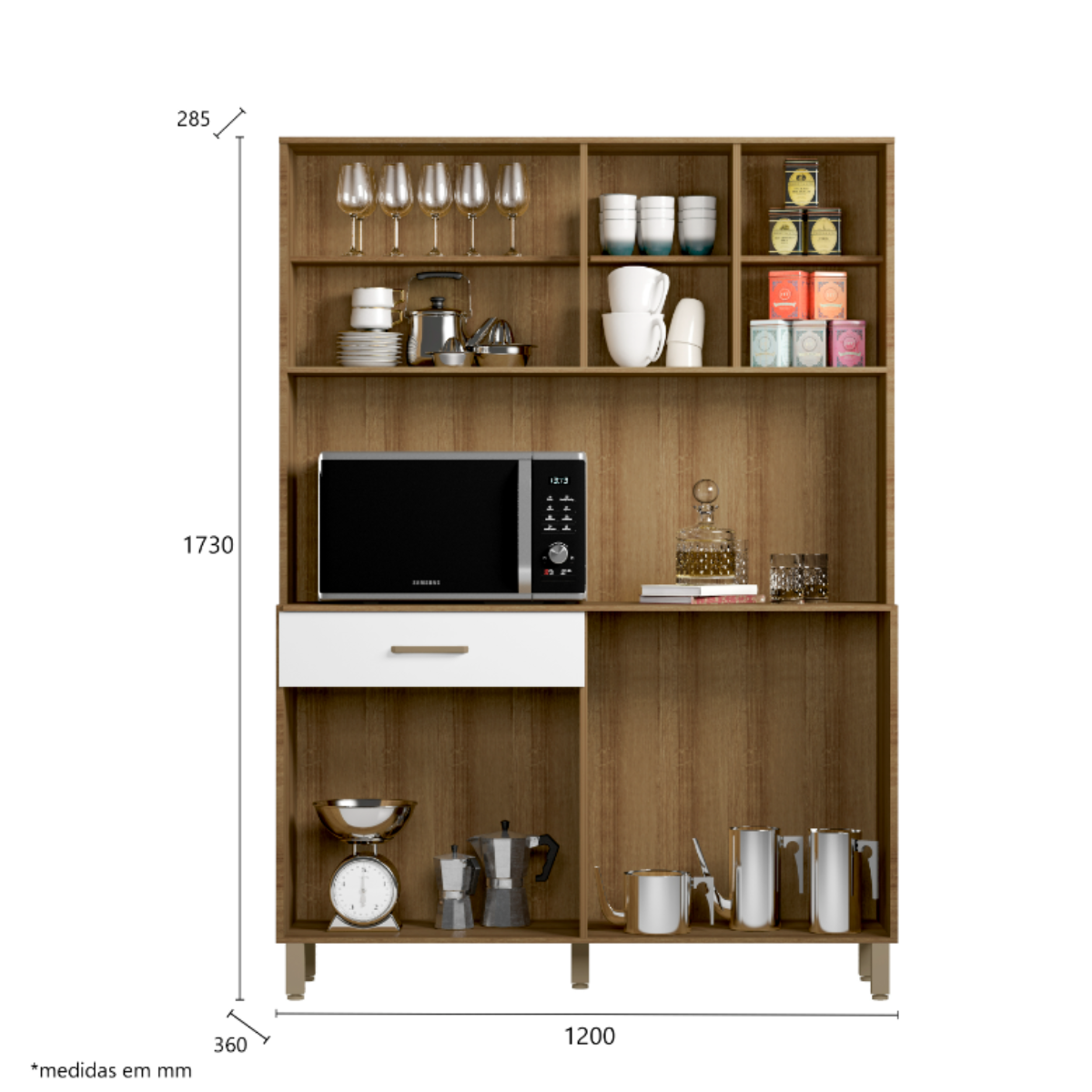 Detalhes: Vidro temperado 3 mm; portas articuladas; gaveta com corrediça plástica
