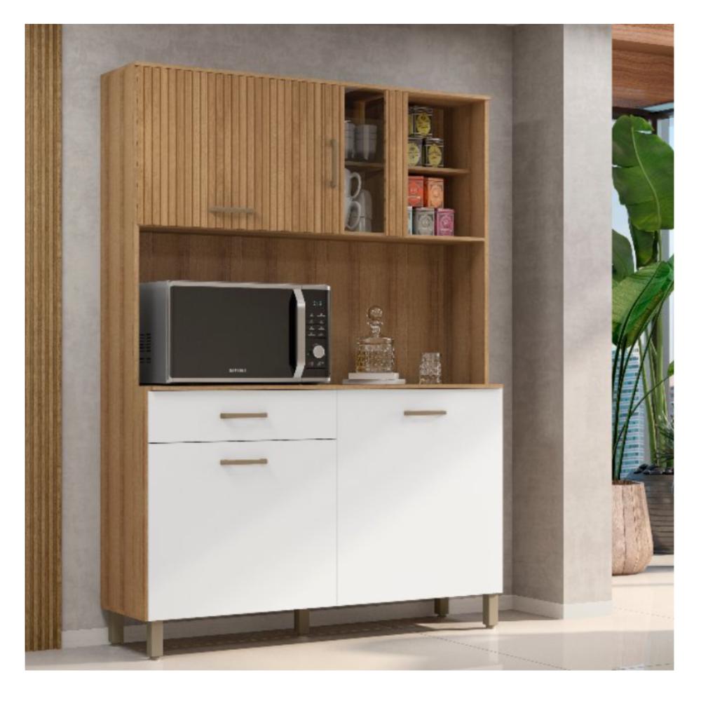 O Kit Cozinha Viena Plus 1200 une praticidade e charme para compor ambientes compactos. Com estrutura reforçada em MDP, portas articuladas e vidro temperado, oferece funcionalidade e um visual moderno no acabamento branco ripado.