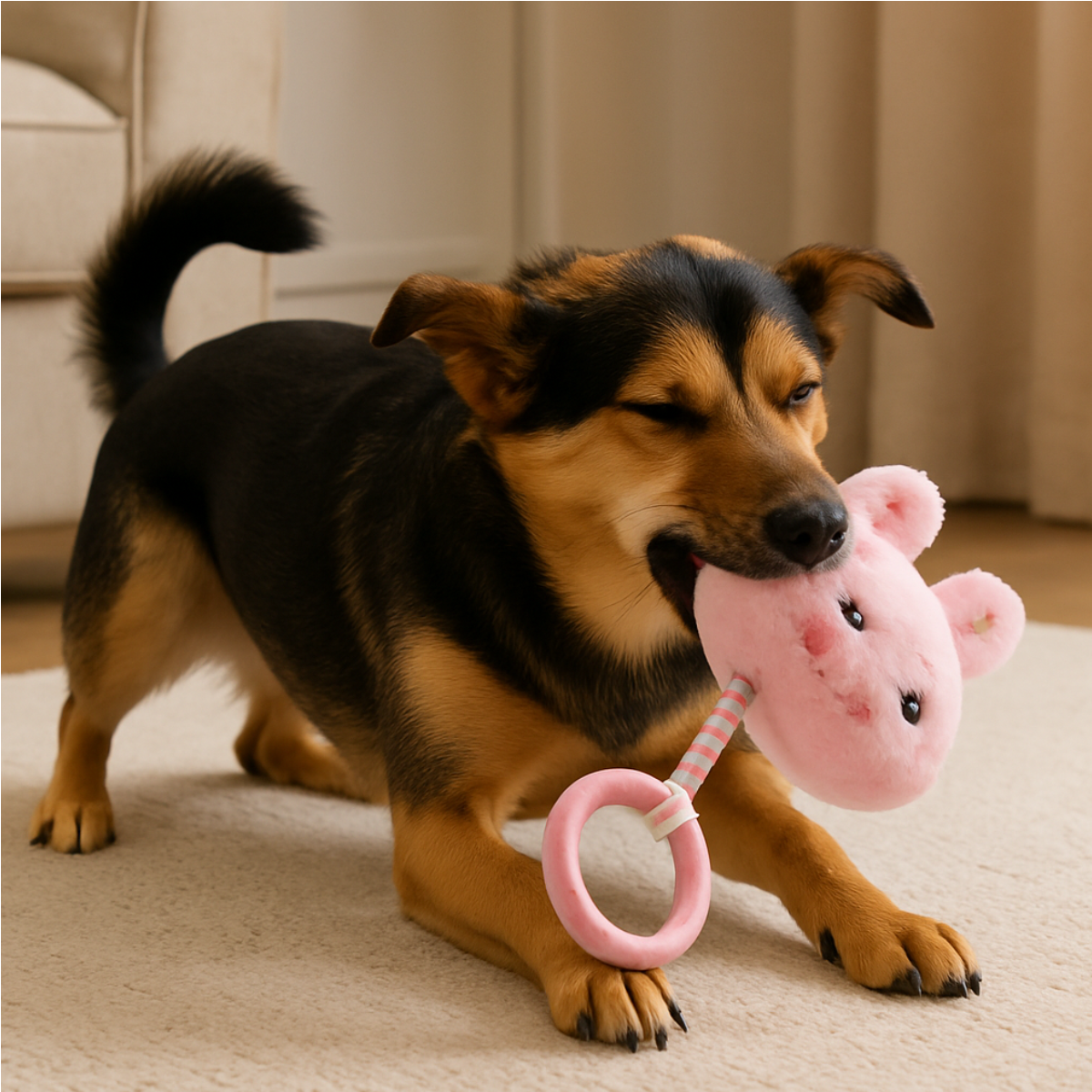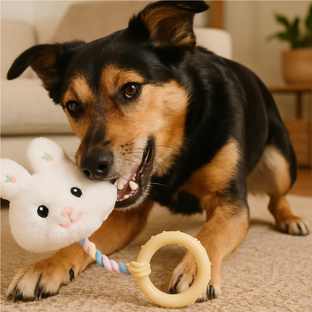 O Brinquedo Pet Pelúcia com Mordedor Coelhinho da Lovely Vibe combina pelúcia macia, corda resistente e mordedor de TPR para proporcionar alívio da dentição, estímulo sensorial e muito conforto. Desenvolvido para filhotes e adultos, oferece uma experiência completa de brincadeira, aconchego e bem-estar.