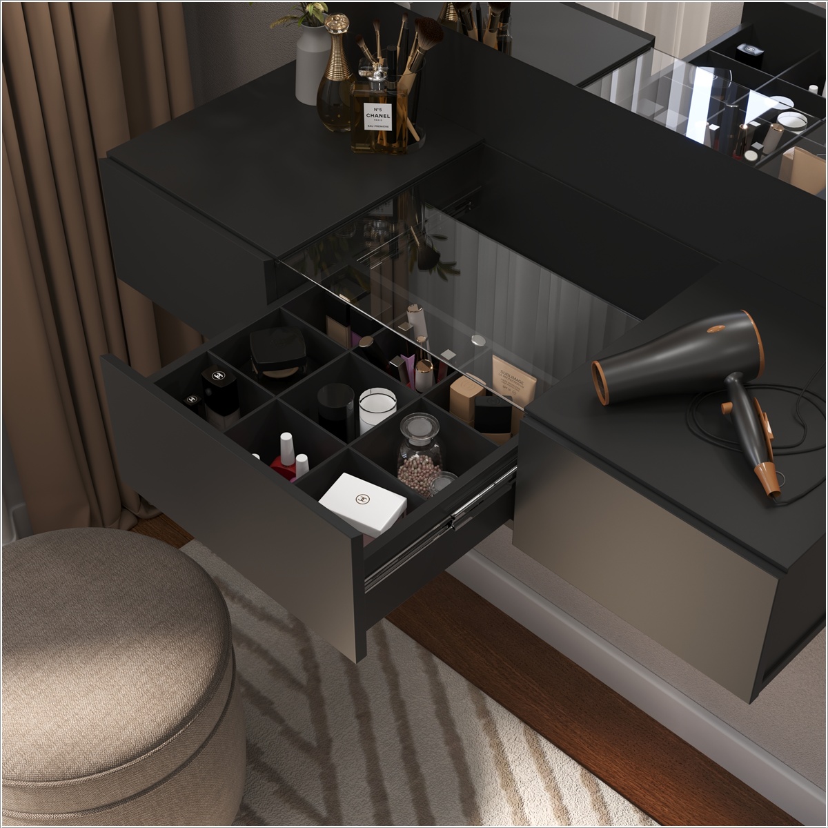 Penteadeira Camarim Suspensa Sofia – Preto Acetinado