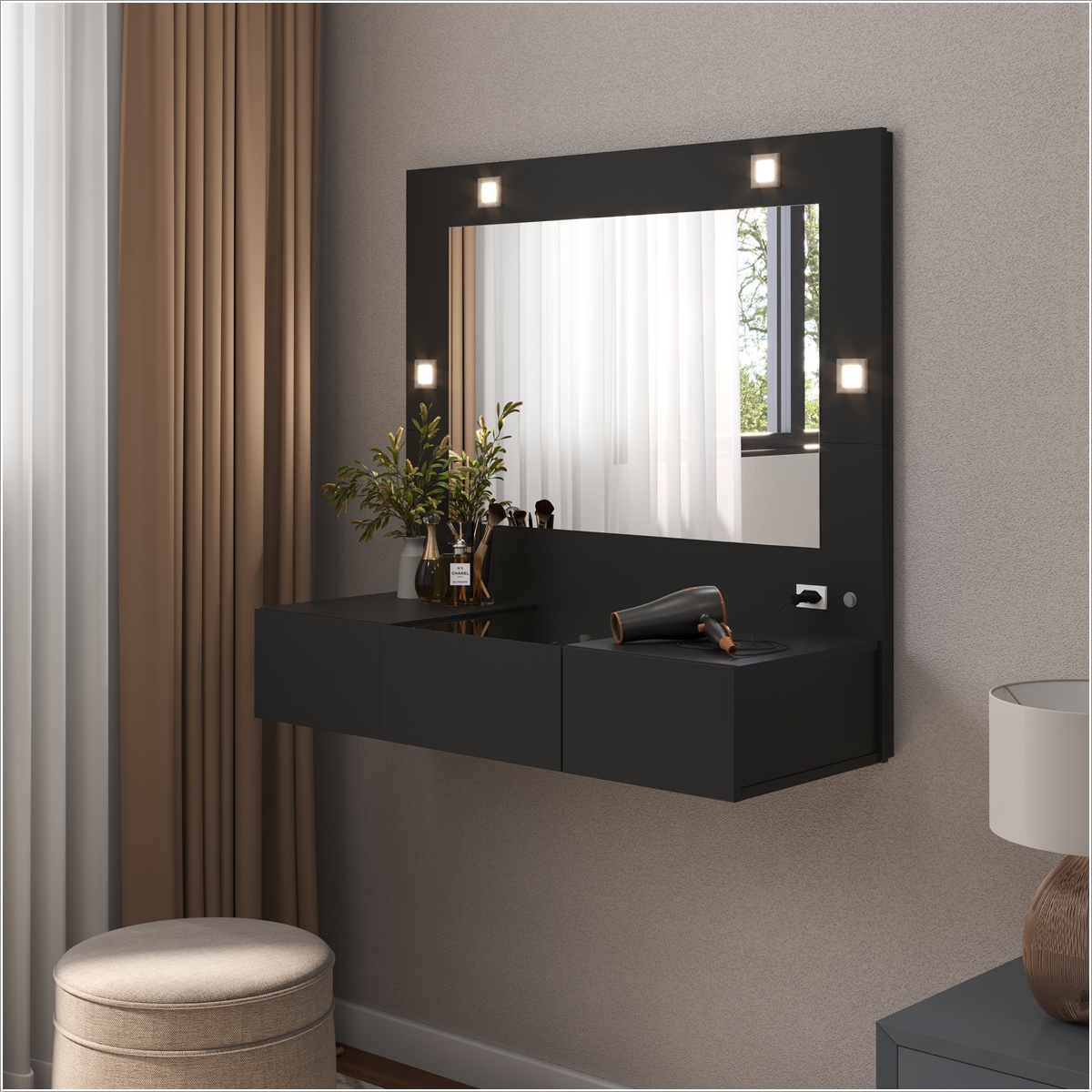 A Penteadeira Camarim Suspensa Sofia une elegância e praticidade em um design moderno para otimizar o espaço. Com estrutura resistente em MDP/MDF, iluminação LED integrada, tomada de 20A e gavetas funcionais, é ideal para criar um cantinho de maquiagem organizado e sofisticado.