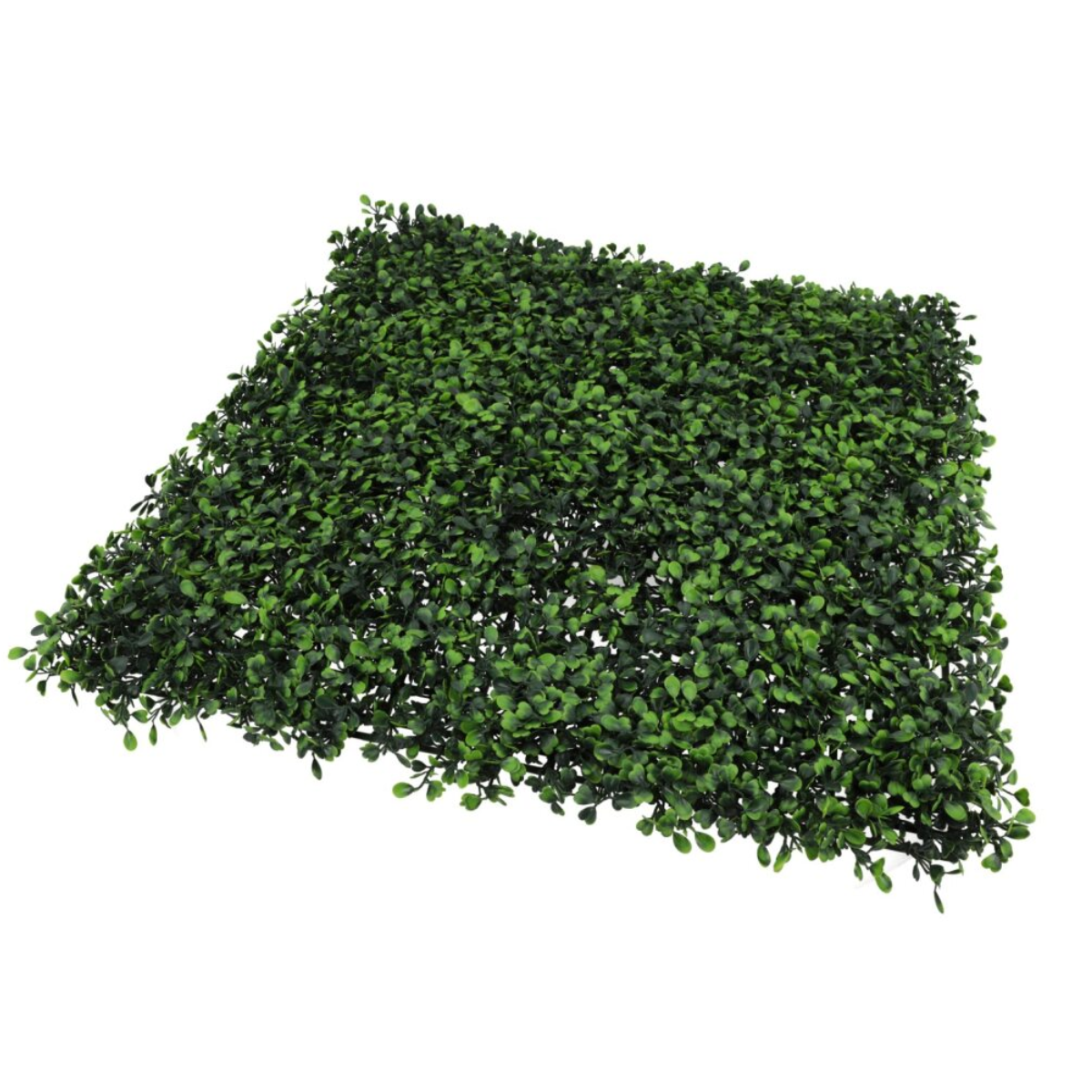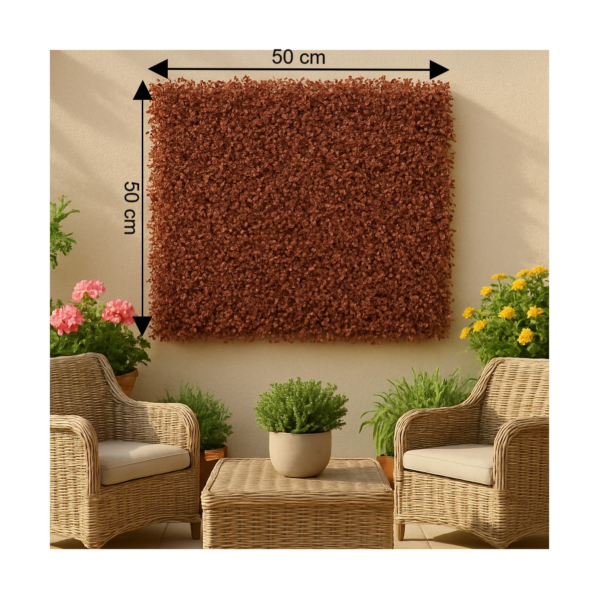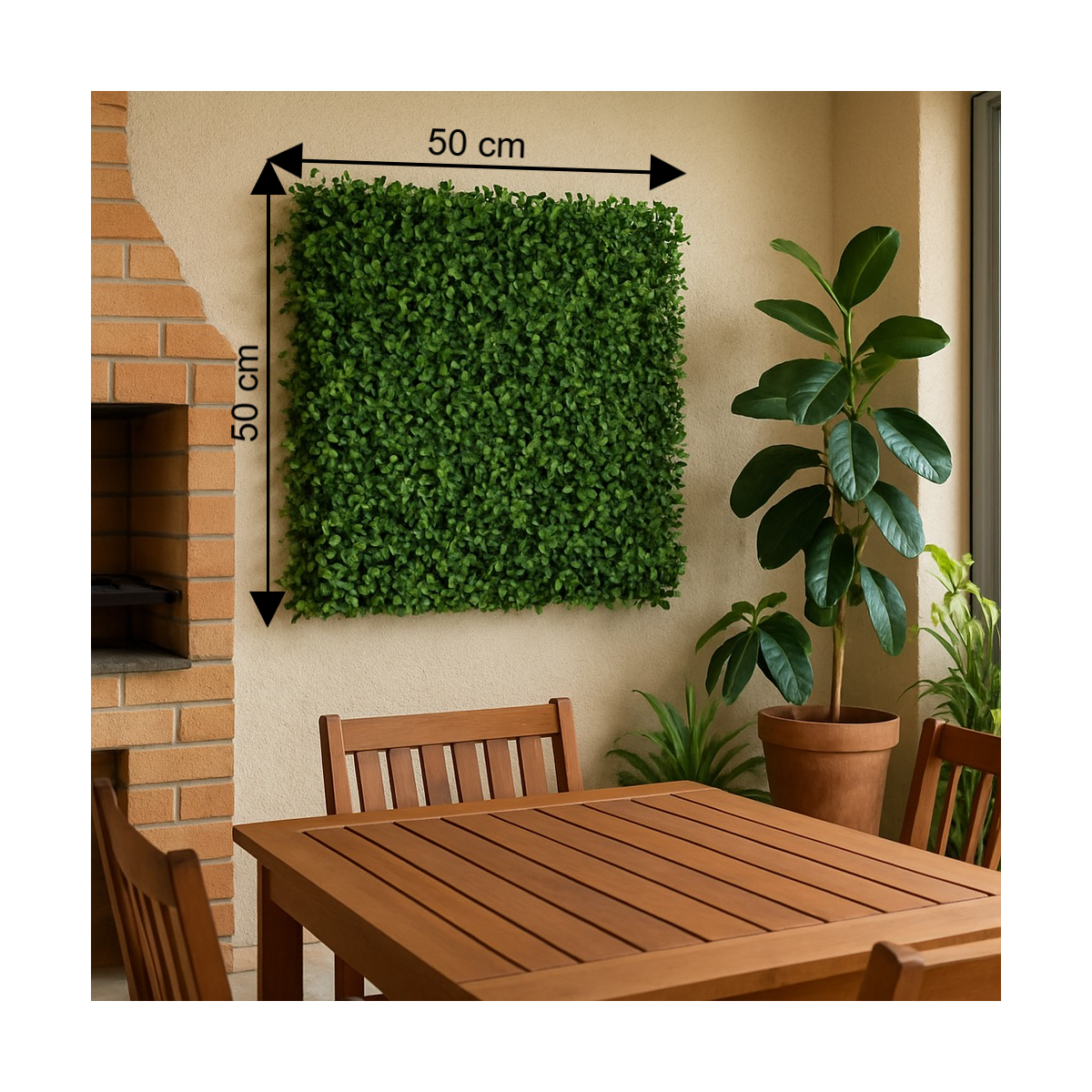 Placa de folhagem artificial tipo buchinho, com 50×50 cm, folhagem densa de aproximadamente 6 cm e acabamento premium. Conta com proteção UV e tratamento retardador de chamas, ideal para painéis decorativos internos e externos.