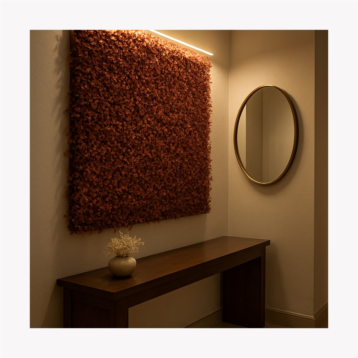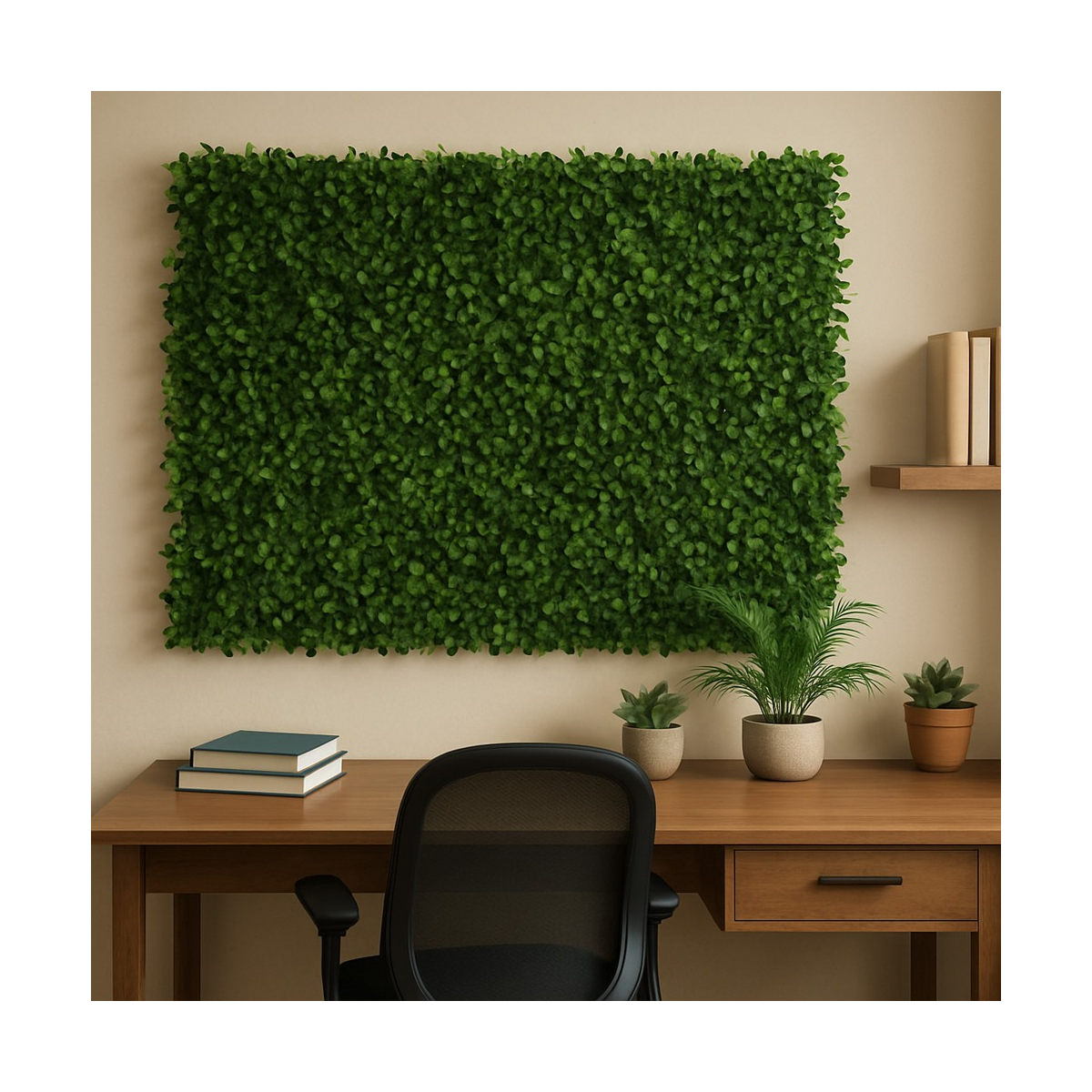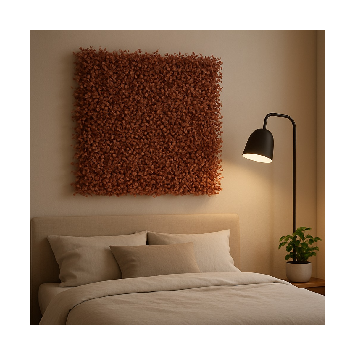 Placa de folhagem artificial tipo buchinho, com 50×50 cm, folhagem densa de aproximadamente 6 cm e acabamento premium. Conta com proteção UV e tratamento retardador de chamas, ideal para painéis decorativos internos e externos.