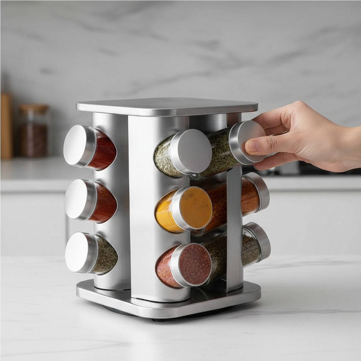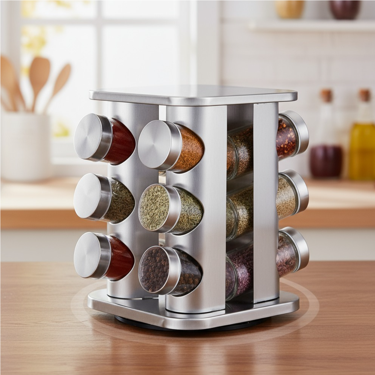 O Porta Condimentos Quadrado Lovely Vibe une organização, praticidade e design moderno, trazendo mais funcionalidade e elegância para a sua cozinha. Com carrossel giratório e estrutura em aço inox, mantém seus temperos sempre visíveis e ao alcance das mãos durante o preparo das refeições.
