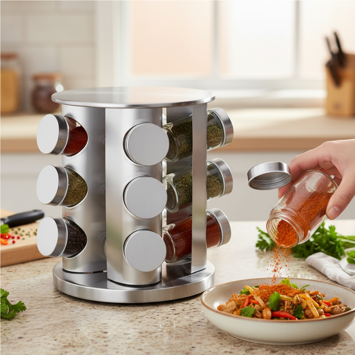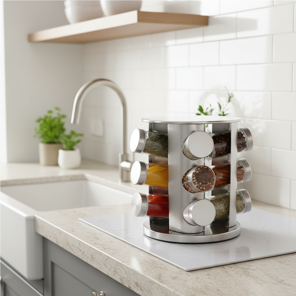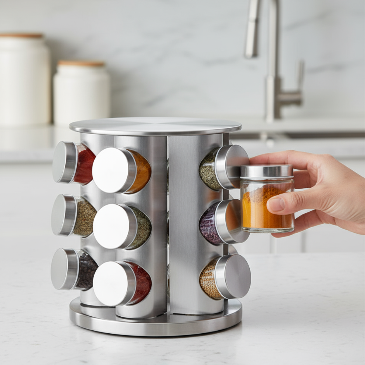 Produzido em aço inox de alta qualidade, o suporte oferece resistência e durabilidade, enquanto os 12 potes de vidro com tampas em aço inox ajudam a preservar o aroma e o sabor dos condimentos por muito mais tempo. Seu design compacto e sofisticado valoriza qualquer ambiente.