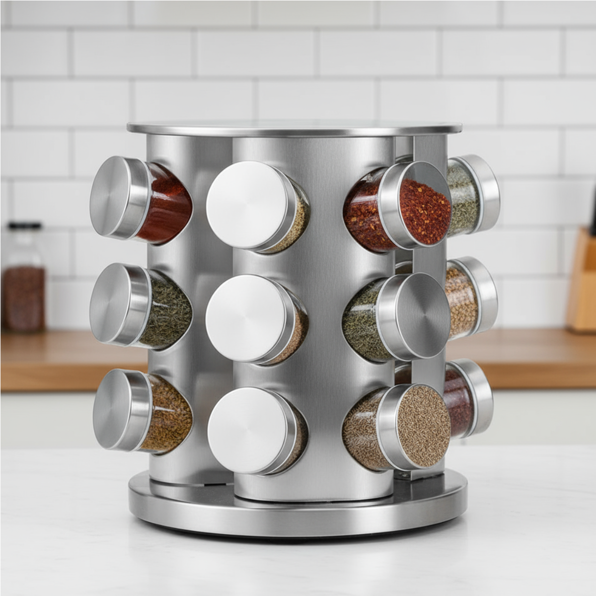 Porta Condimentos Redondo em Aço Inox e Vidro com 12 Peças – Lovely Vibe