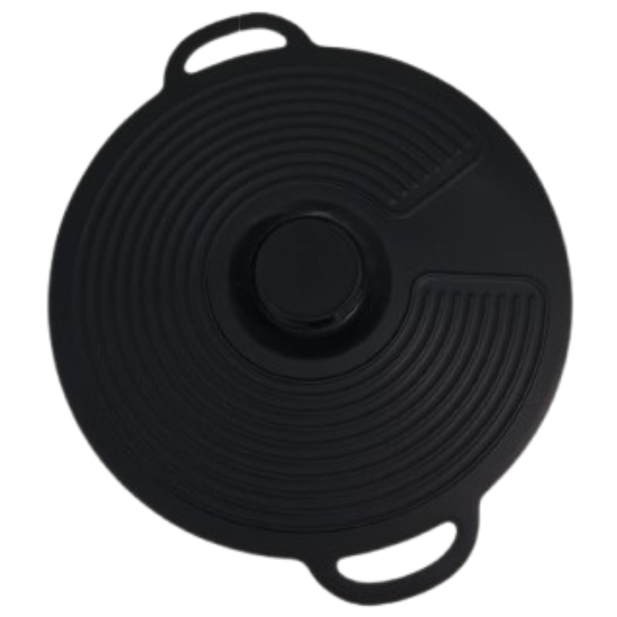 Tampa de silicone reutilizável que se adapta a panelas, bowls e potes, ajudando a preservar o calor e o frescor dos alimentos. Possui puxador central e alças laterais para facilitar o manuseio.
