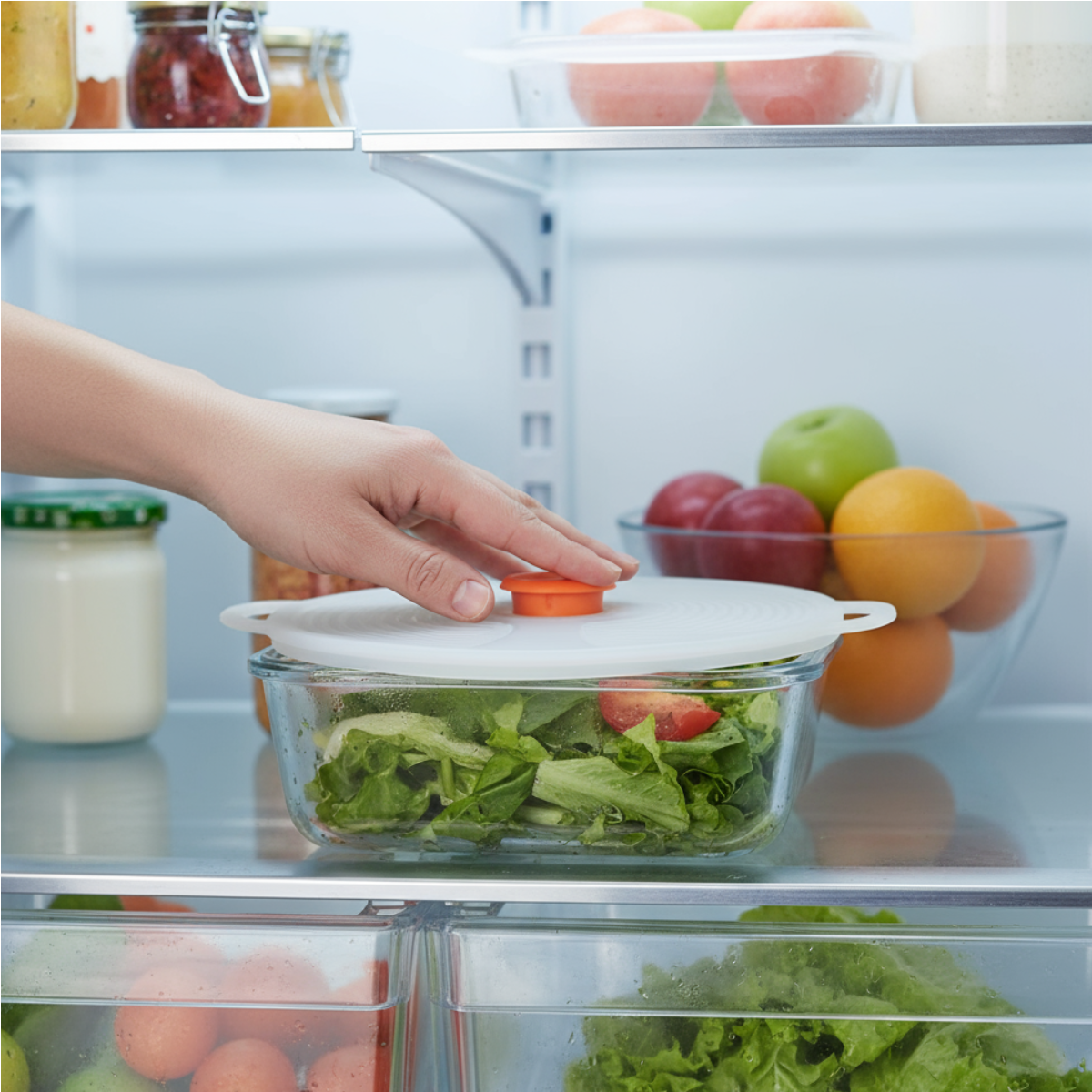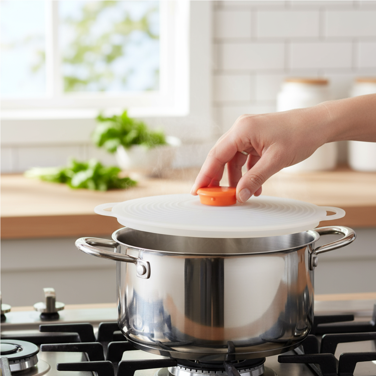 Tampa reutilizável de silicone que serve para panelas, bowls e potes. Oferece vedação eficiente para manter temperatura e preservar alimentos. Possui puxador central e alças laterais para manuseio seguro.