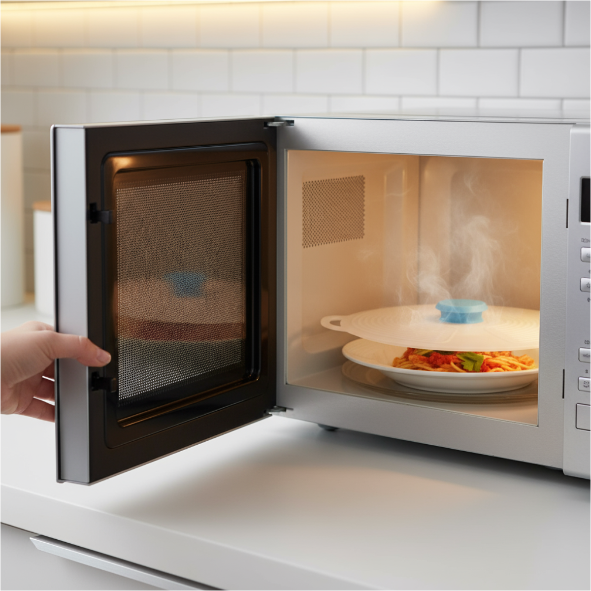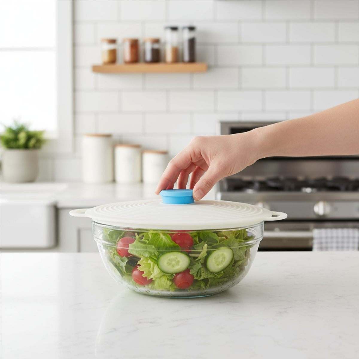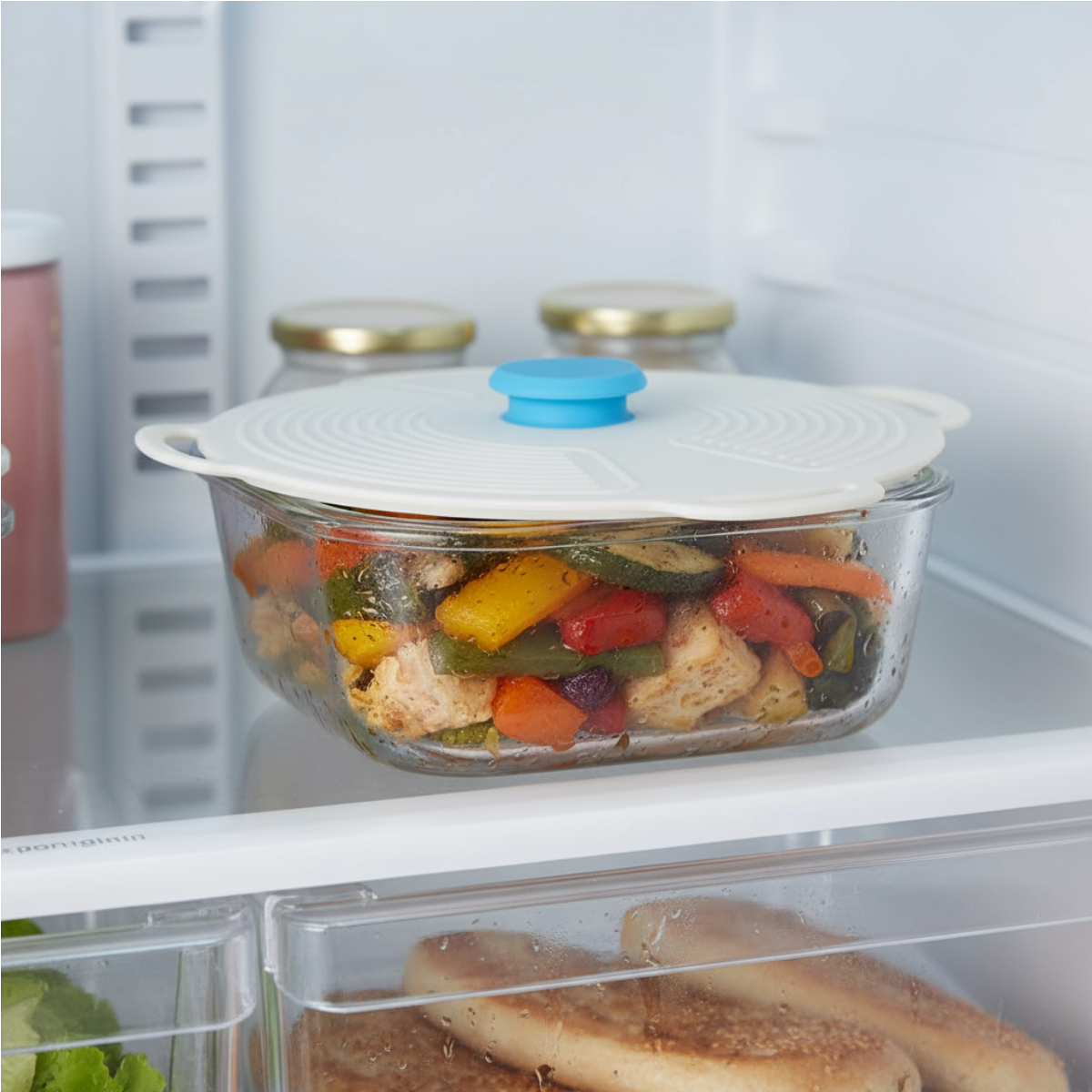 Tampa de silicone reutilizável, ideal para panelas, bowls e potes. Mantém o calor e o frescor dos alimentos, com puxador central e alças laterais para manuseio seguro.